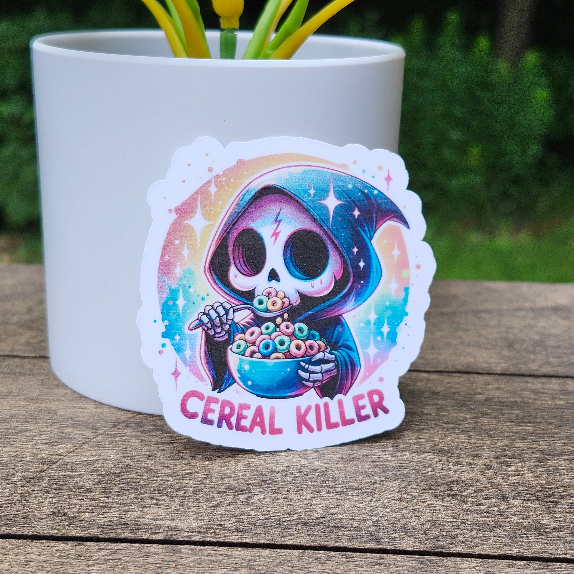Cereal Killer Sticker – Cute Grim Reaper Vinyl Sticker – Funny Breakfast Pun Sticker – Waterproof Spooky Sticker for Laptop or Water Bottle