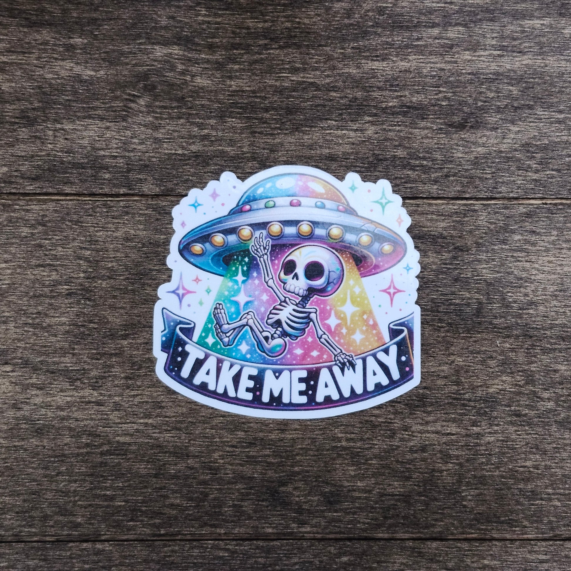 Take Me Away Sticker – UFO Abducting Skeleton Vinyl Sticker – Funny Alien Sticker for Laptop, Water Bottle, Journal